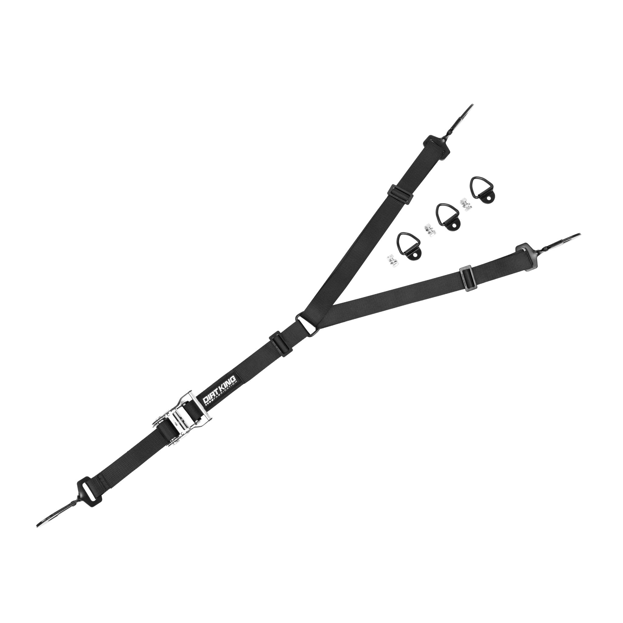 The Dirt King 3 way spare tire strap is simple and effective way to secure your spare wheel. It has a compact handle and holds up great outdoors. D-rings and mounting hardware are included. Works with one spare tire or a pair of stacked tires.