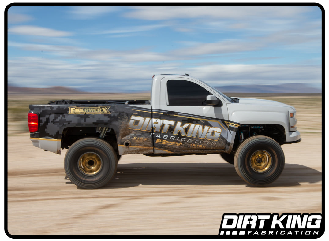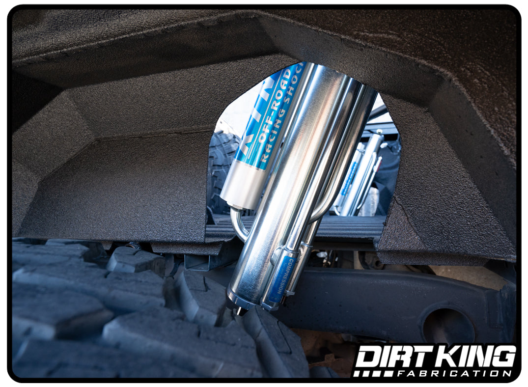 The Dirt King bed cage spec king bypasses are custom built for optimum performance. After building countless trucks with standard off the shelf bypasses we found that there was a lot of room for improvement by modifying the bypass tube locations and valving. This resulted in a smooth ride on road and through small terrain while it gets progressively stiffer when going through rough terrain or jumps. The shocks and ready right out of the box for leaf over or leaf under sprung trucks. To fine tune the ride quality a shock tech can quickly make adjustments without removing the shocks from the vehicle. Please note that bypass shocks are noisy due to the steel needle that engages and disengages when fluid bypasses the piston.