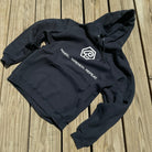 White logos on the front of a black hooded sweatshirt. Nice and thick with a soft fleece texture inside and a durable outside - we pretty much just went shopping in our own closets and picked our favorite! These size out like your standard hoodie, but a little more generous in the shoulders and torso length.